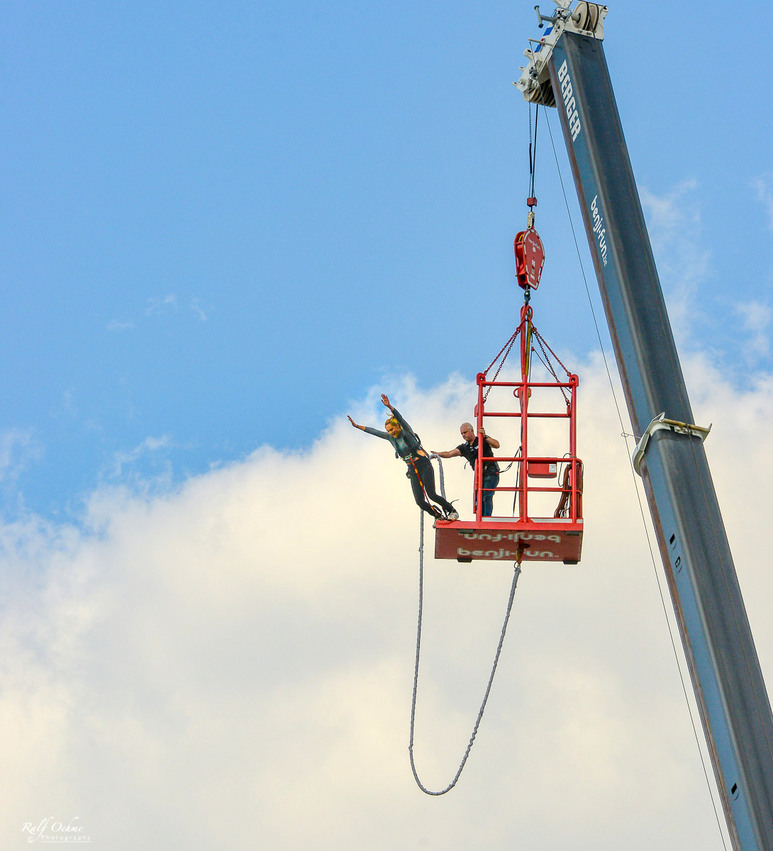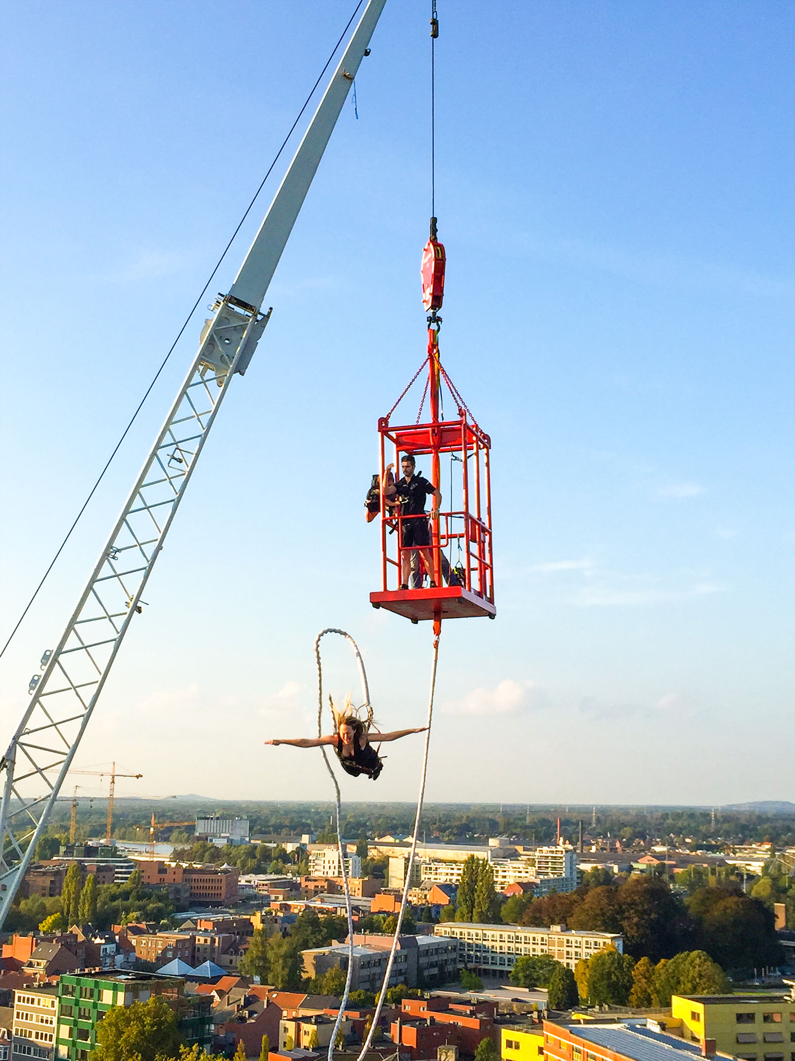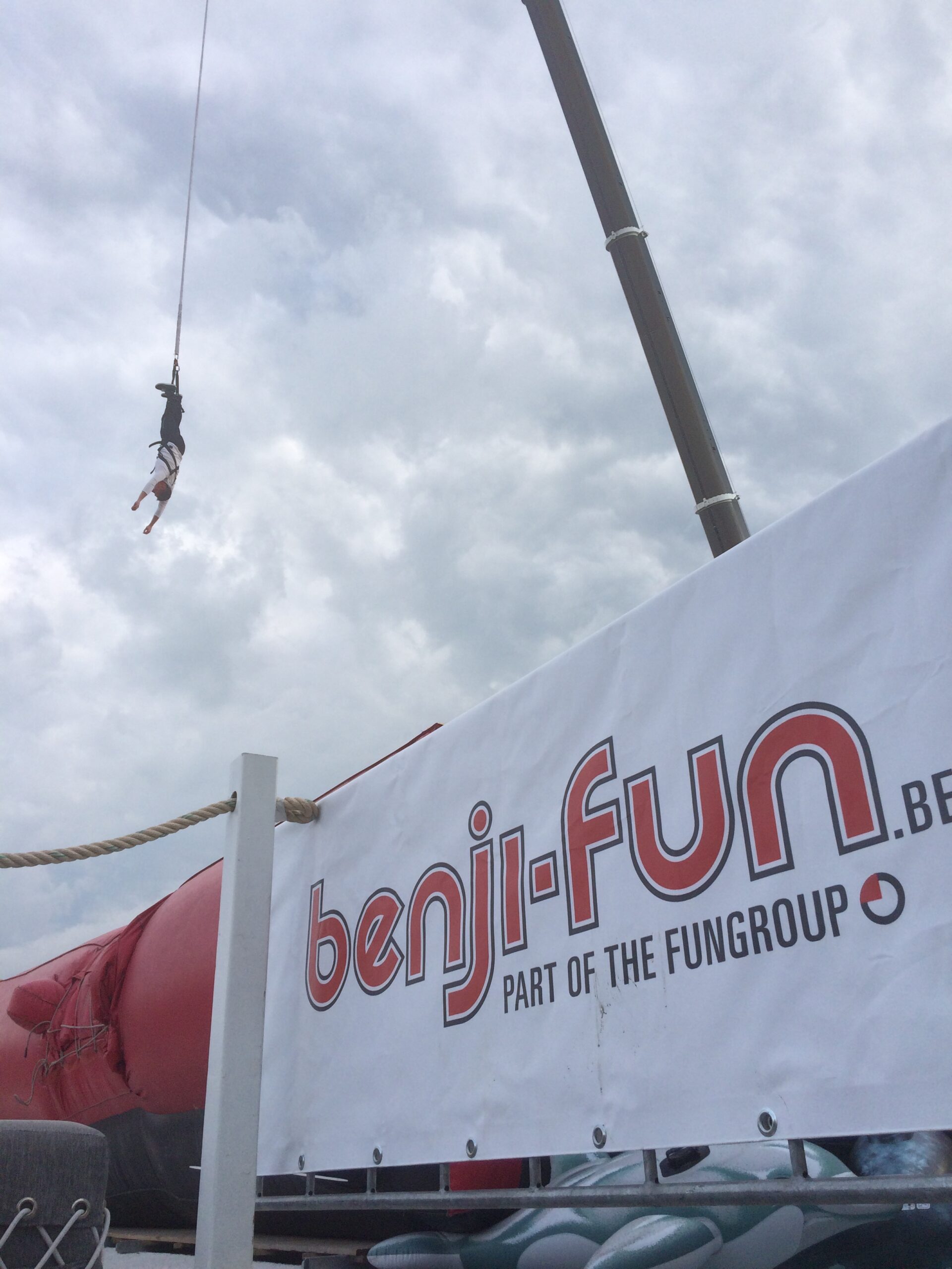 Bij Benji-Fun werken we meestal van een standaard mobiele hijskraan van 60m hoogte. Beveiligd aan een harnas, beenbinders en elastiek, spring je onder professionele begeleiding naar beneden.